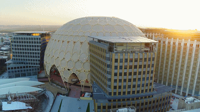整個(gè)建筑的圓頂裝有252臺(tái)投影儀,形成了沉浸式360度投影表面,館內(nèi)外的參觀者均可看到,這使得它成為世界上最大的360度投影面。