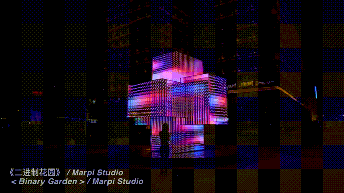 白天作為空間雕塑反射周圍的環(huán)境并通過鏡面與行人互動;夜幕降臨,塔身LED視覺系統(tǒng)啟動,逐漸演變?yōu)橐粋€炫麗的人工智能數(shù)字塔,呈現(xiàn)著當(dāng)代媒體藝術(shù)家們基于人工智能技術(shù)所創(chuàng)造的全新視覺語言。